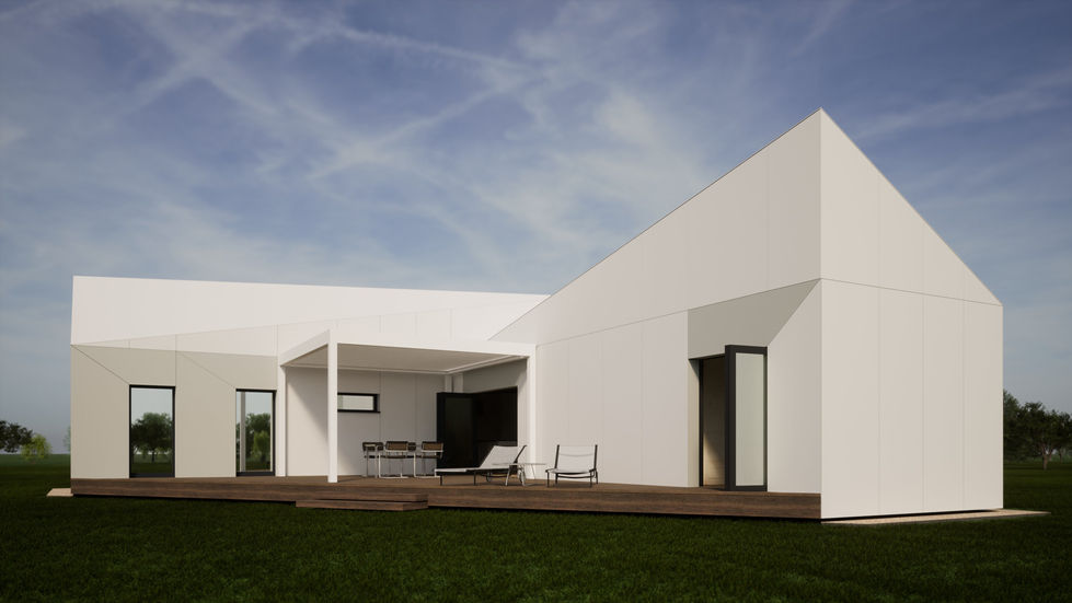 Projekt domu jednorodzinnego na bazie dwóch modułów ułożonych w plan litery L, z wyjściem na taras oraz dachem skośnym, z możliwością samodzielnego montażu. Powierzchnia użytkowa: 77,2m2. Ściany konstrukcyjne i działowe oraz strop zaprojektowano z paneli z drewna klejonego HBE o grubości 10 i 12 cm.